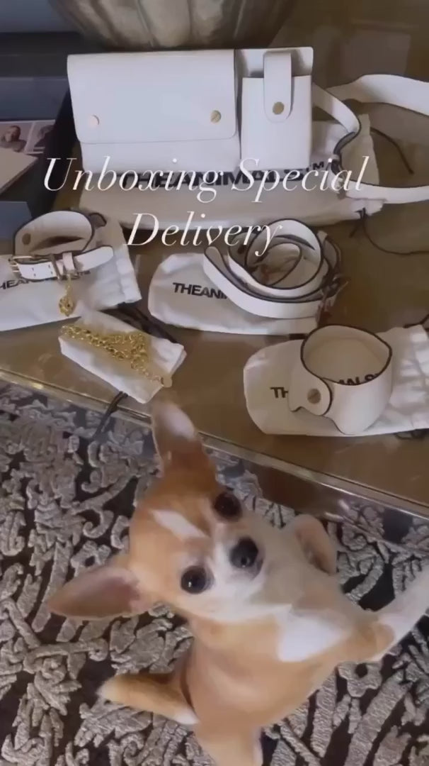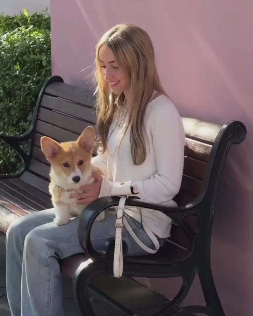 Crafted from smooth A grade (lamb) nappa leather, accented with matt black edging. Available in white with custom brass hardware or cinnamon with contrasting bone coloured thread and silver-tone hardware. Choose from short or long leads with adjustable handles for comfort and safety. Complete the look with matching Collar, Harness, Caca Sac and Utility Sac. Packaged with branded dust bag and box.